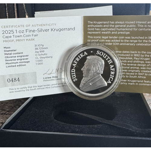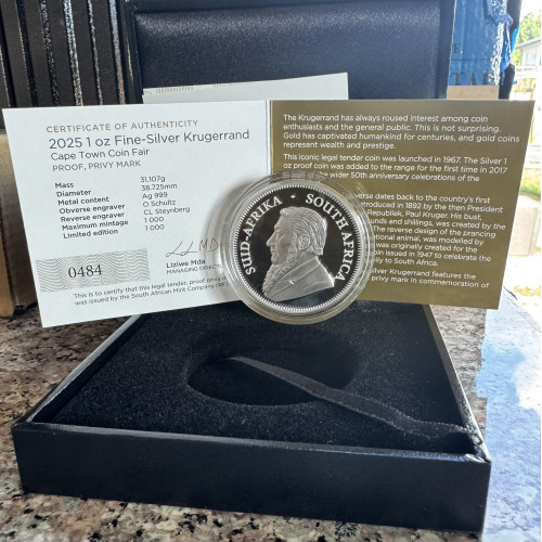 - Product Code: 2025 KRUGERRAND PRIVY MINT MARK *CAPE TOWN *1oz FINE Silver