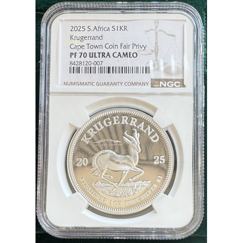 - Product Code: 2025 KRUGERRAND PRIVY *CAPE TOWN*1oz FINE Silver PF70UC - NGC