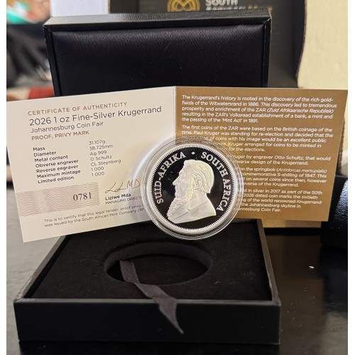 2026 KRUGERRAND PRIVY MINT MARK *JHB*1oz FINE Silver - PROOF IN SAMINT BOX & COA; KRUGERRAND ; PAUL MKRUGER ; SILVER ; SOUTH AFRICA SILVER COIN