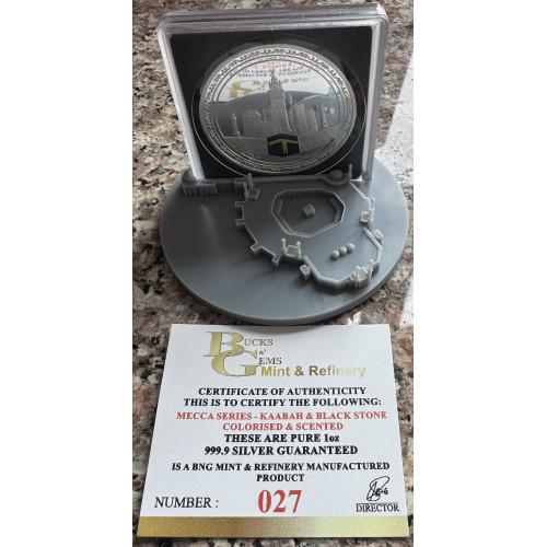 A 1oz silver 999.9 bullion, Saudi Arabia's Mecca AL-HARAM Kaabah & Black Stone, Colorised and scented with the scent of the Black Stone that was placed in the Kaabah corner , the stone came down from heaven many many years ago.