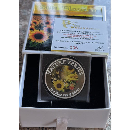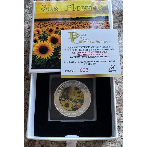 Tags: 1oz SILVER 999.9 "SCENTED" NATURE SERIES COLORISED & SCENTED "SUNFLOWER " BnG MINT
