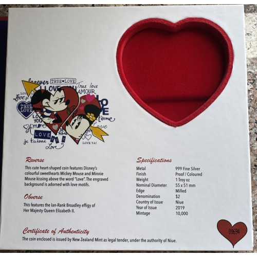 - Product Code: 2019 DISNEY $5 NIUE MICKEY & MINNIE HEART 1oz SIL PF70