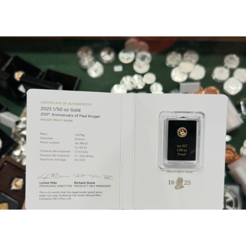 2025 KRUGERRAND 1/50oz GOLD 24KT PROOF - PAUL KRUGER 200 BIRTHDAY - MINT MARK 1825 SAMINT AS ISSUED & CERTIFIED